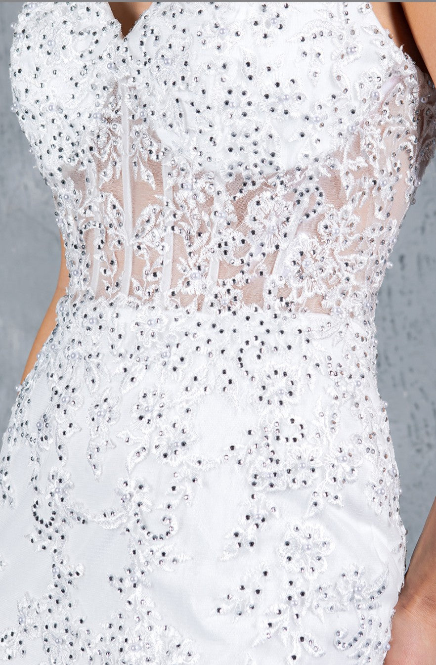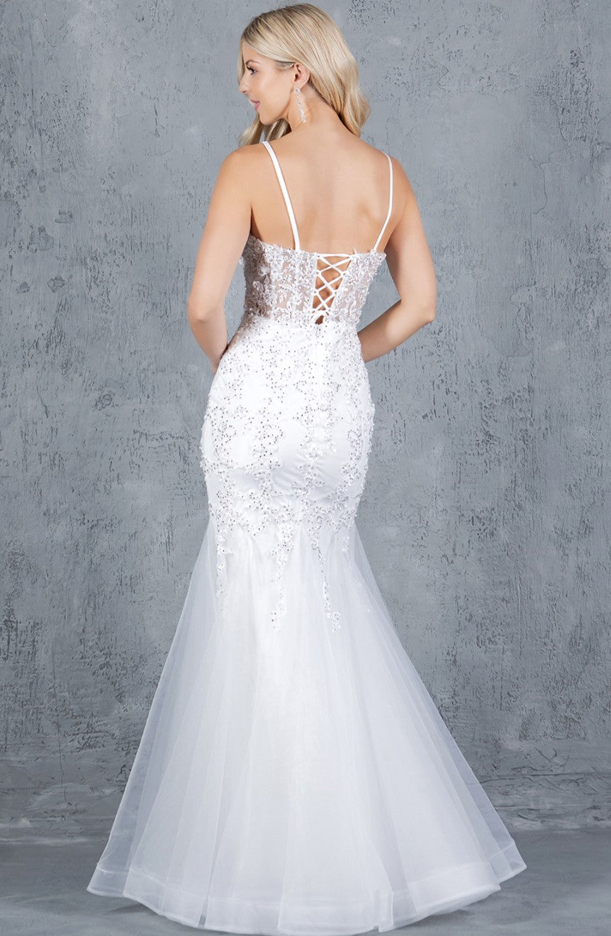 An elegant, romantic, modern corset mermaid gown with a fitted bodice featuring intricate lace embroidery adorned with floral motifs, beads, and pearls. The sweetheart neckline adds a romantic touch, while thin spaghetti straps offer light support. The skirt is fitted through the hips and gradually flares into a mermaid silhouette. A tulle overlay adds volume and a dreamy effect, creating soft movement. The delicate embroidery continues down the skirt, further enhancing the gown's elegance.